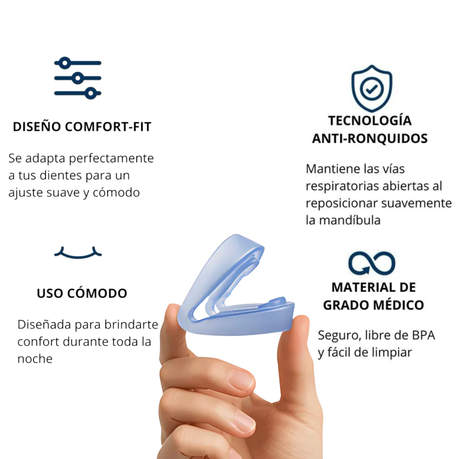 Tecnología Anti-Ronquidos: reposiciona la mandíbula suavemente, sin presión ni incomodidad