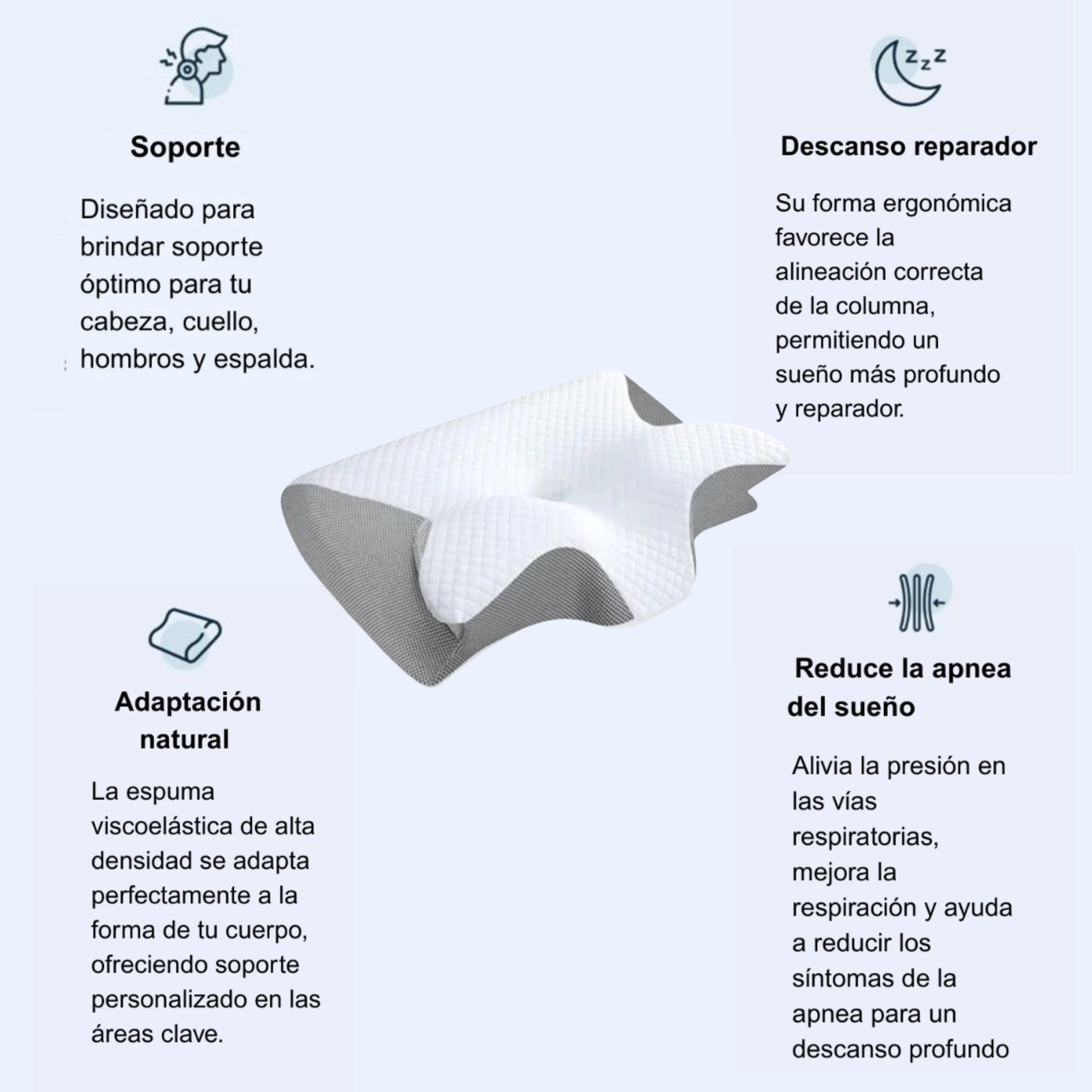 🔹 Cavidad central: se adapta perfectamente a la cabeza, manteniendo el cuello alineado con la columna vertebral.